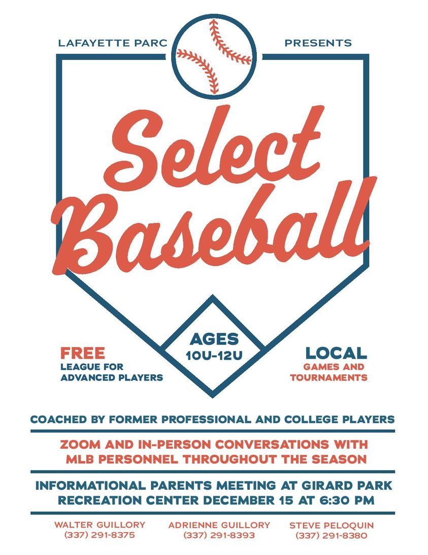 Lafayette PARC is offering Select Baseball for 10U-12U. There will be an informational meeting for parents on Thursday, December 15 at 6:30 p.m. at the Girard Park Recreation Center!